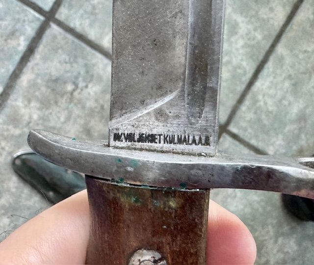 Made by O.Y. Veljekset Kulmala, A.B. and marked with the 'Sk.Y' (Suojeluskunta) for the 'White or Home Guard' on the blade ricasso and the '=S=' (Civil Guard acceptance) on the crossguard. Wood handle held by two slotted screws. Short bright fullered blade with some staining and light sharpening. Green leather scabbard with retaining strap marked 'Sk.Y.' on the front with steel reinforced tip. Only 10,000 made. Authentic, rare and very hard to find. Rarity: R3 Condition: VG+ Price: $850 |